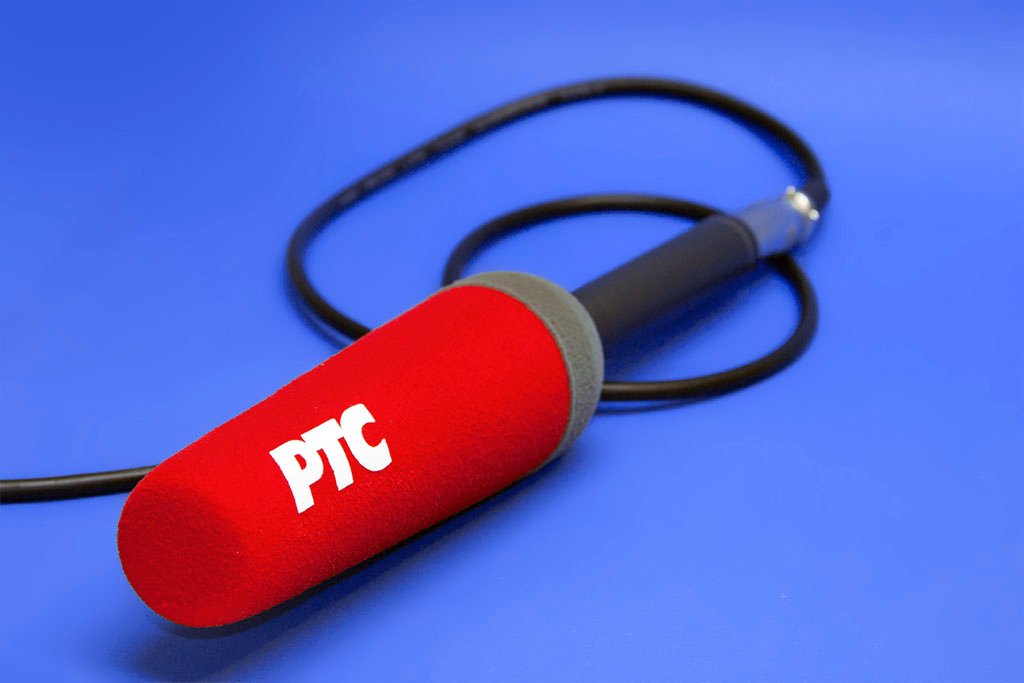 Colorful foam microphone covers with logos from RØDE, RMF, blu radio, and other broadcasters in a studio setup.